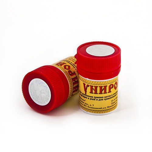 Унирой - препарат предназначенный для обработки плодных и неплодных маток перед посадкой в безматочные пчелиные семьи и привлечения и поимки роев на пасеках в период роения пчелиных семей.