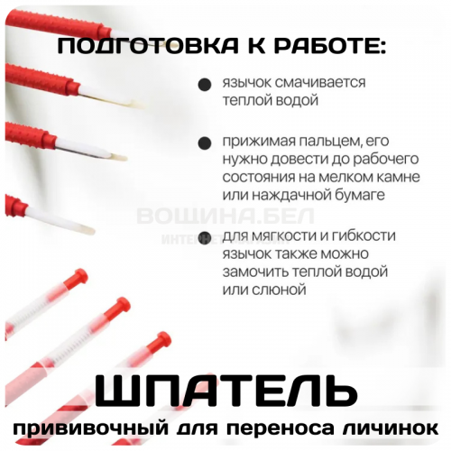 С помощью китайского шпателя можно легко захватить личинку вместе с каплей маточного молочка, которое присутствует в ячейке. Это поможет будущей особи легче прижиться в мисочке. Каждый шпатель проходит проверку качества, призванную исключить возможность брака.